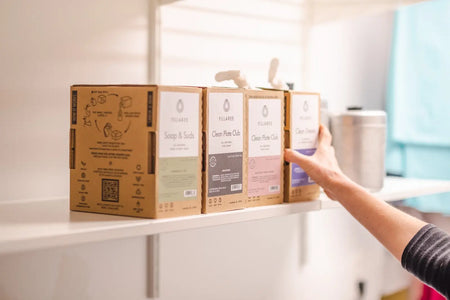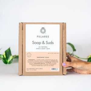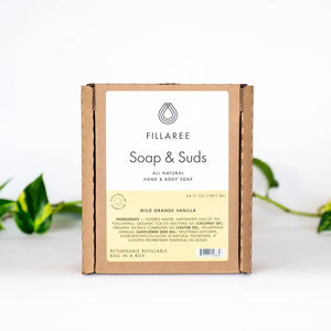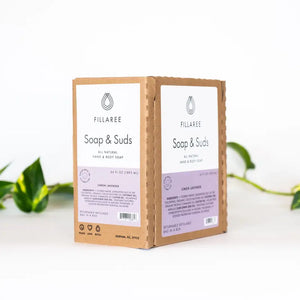 The box Includes a half-gallon of Fillaree's versatile Soap and Suds Hand/Body Soap, a reusable spout, and a sustainable storage box allowing you to refill your dispensing bottles multiple times. Once empty, refill your bag with Ekologicall.