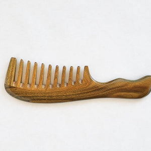 Sandalwood combs are anti-static and won't rip hair out, but instead will gently detangle. The combs are coated with a wax when made, to protect them. This wax will wear off in time. If you like, you can treat your comb occasionally with olive oil to condition the wood. As the wood ages, it will turn shades of green, which really adds to its beauty! The scent of the sandalwood alone makes this comb such a treat to use.