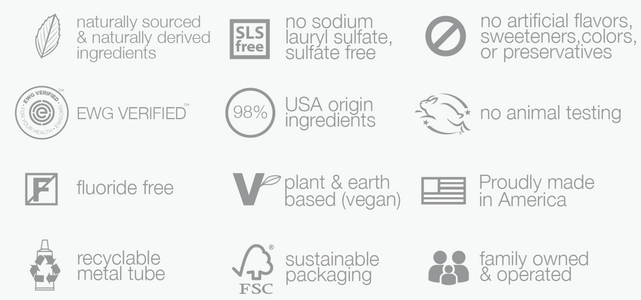 - Ingredients: calcium carbonate (limestone abrasive), vegetable glycerin, purified water, sodium bicarbonate (baking soda), xylitol (birch derived), hydrated silica, activated charcoal, sodium cocoyl glutamate, carrageenan (seaweed derived), cocos nucifera (coconut) oil, mentha piperita (peppermint) oil, mentha viridis (spearmint) leaf oil, pimpinella anisum (anise) seed extract, gaultheria procumbens (wintergreen) leaf oil, stevia (leaf extract).